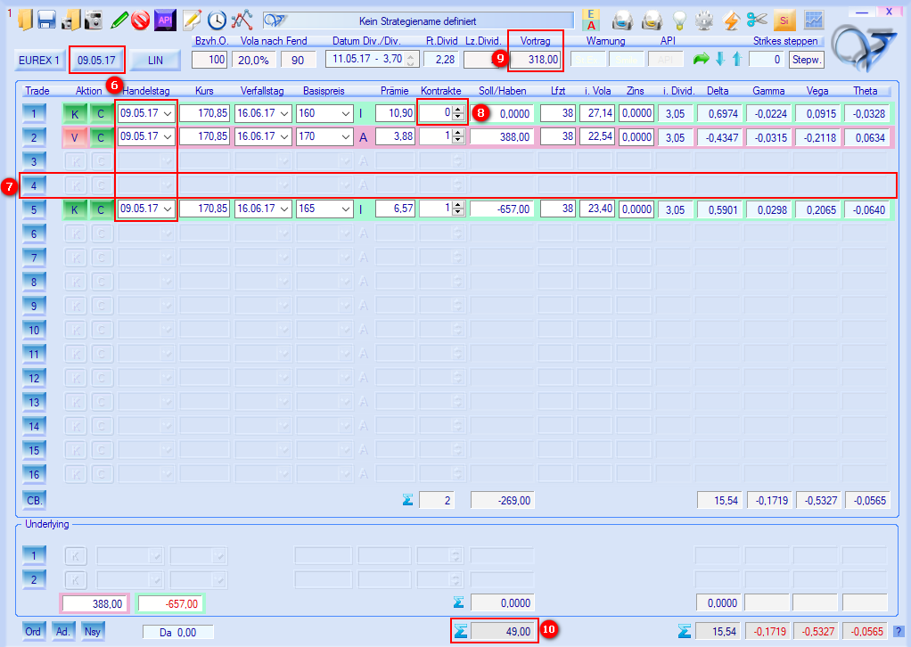 Wir haben einen Einstiegszeitpunkt vom 02.01.2017. Der Verfall liegt im Juni 2017, das sind 165 Kalendertage. Am 09.05.2017 erfolgt eine Follow-Up-Aktion, bei der eine Position gerollt wird (siehe Pos.2 in Abb.1).